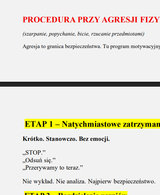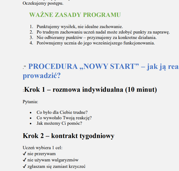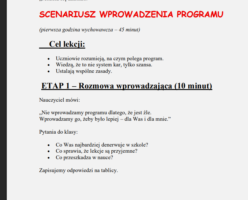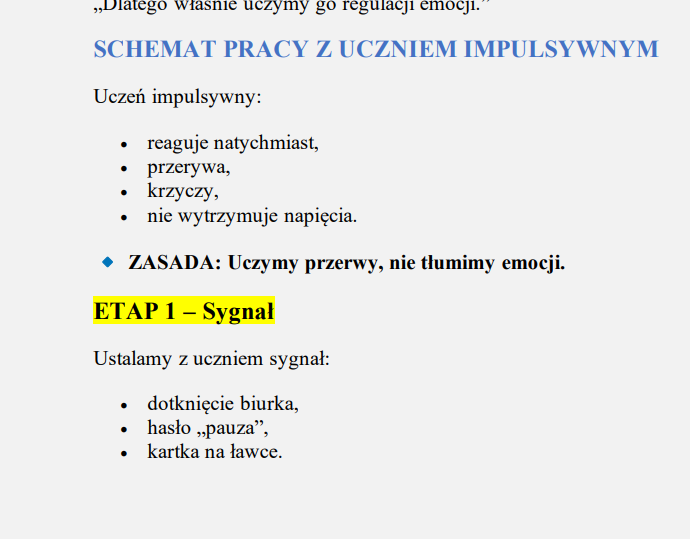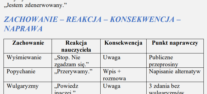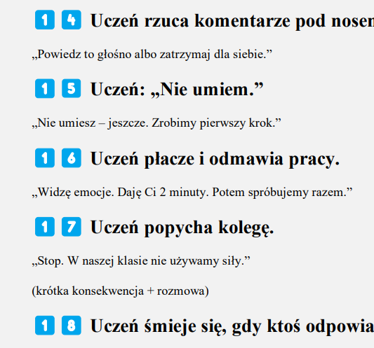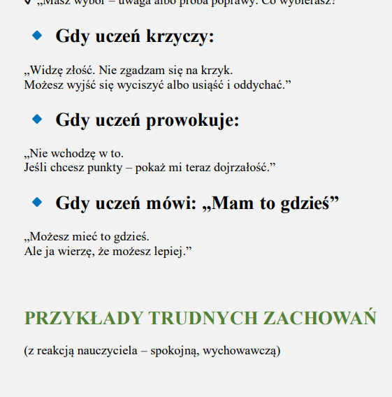 – gotowe reakcje na trudne zachowania ucznia i klasy,