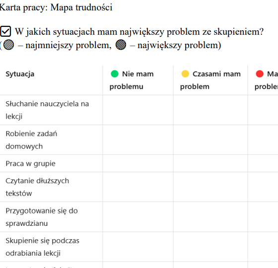 Ćwiczenia, karty pracy, techniki koncentracji i samokontroli