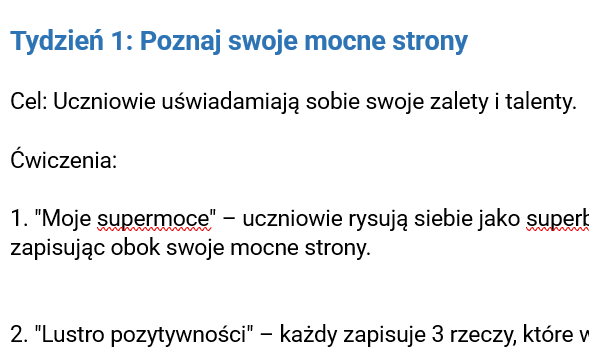 Tydzień 1: Odkrywanie mocnych stron – Uczniowie poznają swoje talenty i uczą się dostrzegać w sobie to, co najlepsze.