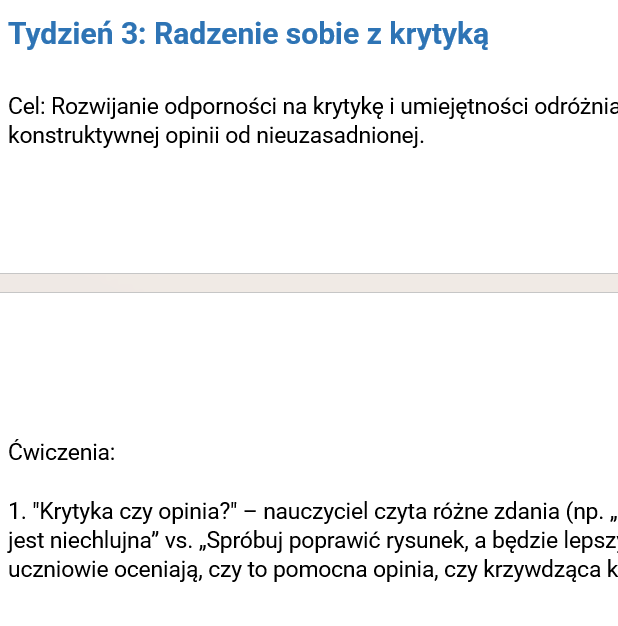 Tydzień 3: Radzenie sobie z krytyką – Techniki ochrony przed destrukcyjnymi opiniami i umiejętność przyjmowania konstruktywnej krytyki.