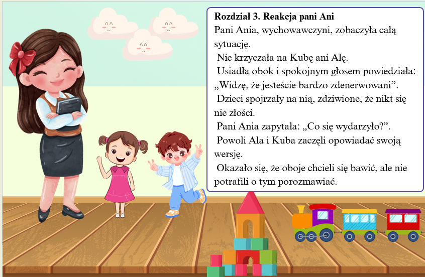 Bajkę w rozdziałach – krótkie, angażujące historie z życia dzieci, pełne emocji i codziennych sytuacji.