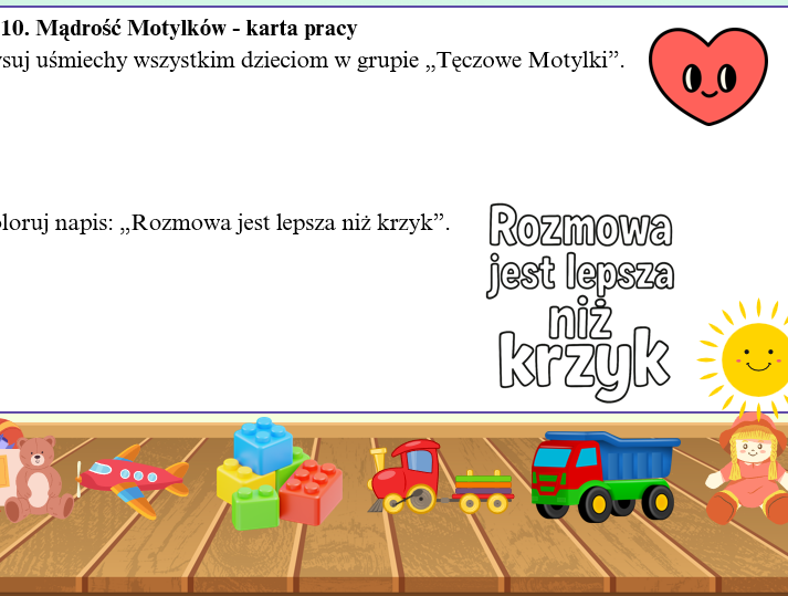♀️ To niezwykła bajka, podzielona na 10 rozdziałów, w której dzieci z grupy „Tęczowe Motylki” uczą się, jak zamienić krzyk, kłótnie i smutek w rozmowę, zrozumienie i współpracę. Każdy rozdział to osobna przygoda, bliska doświadczeniom przedszkolaków.