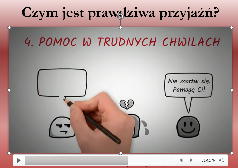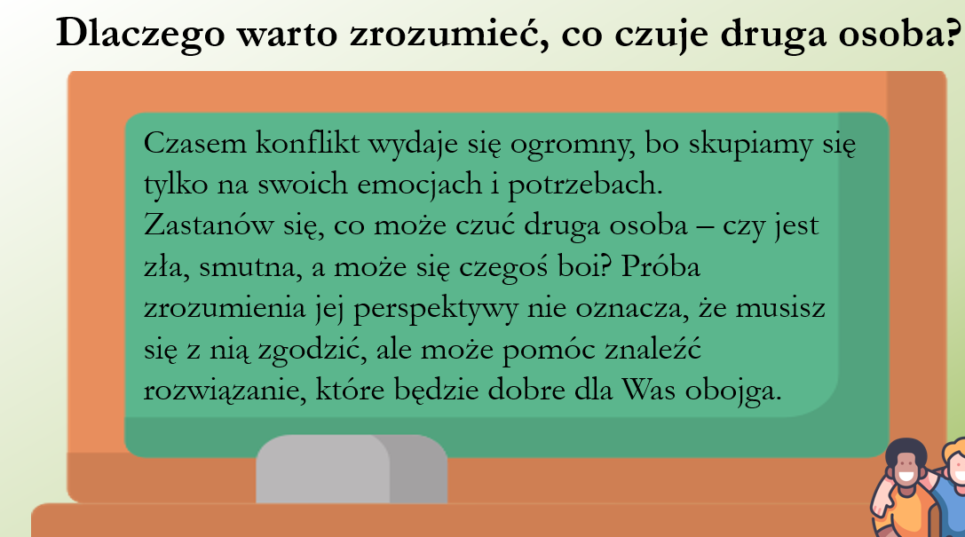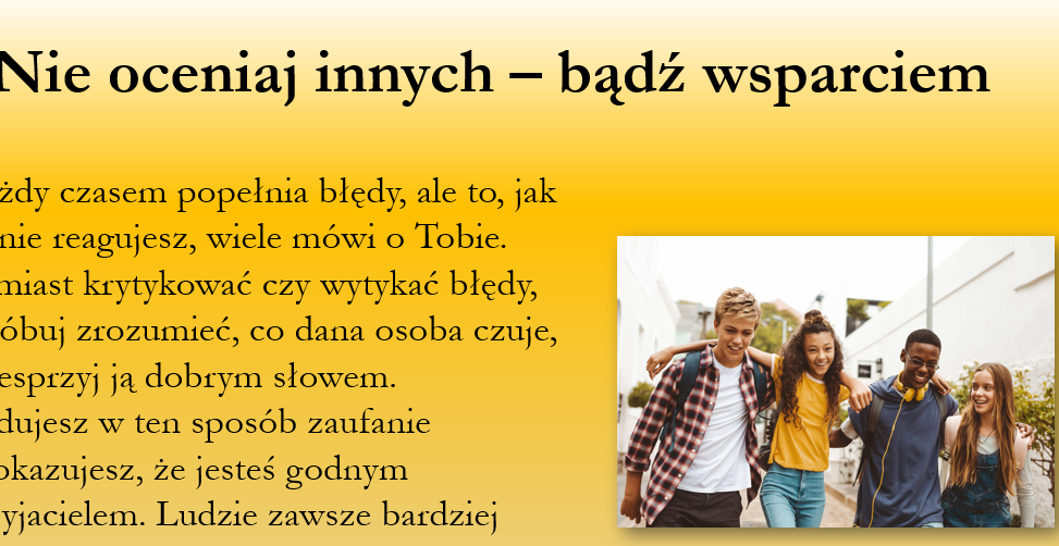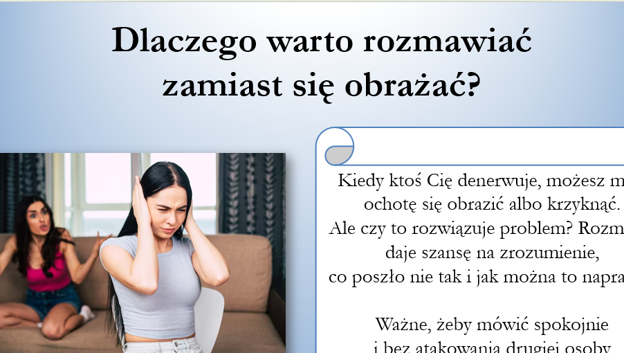 Prezentacja 25 slajdów do pobrania,wydruku i czytania w formie pliku pdf i PP z filmikami dotyczy sposobów rozwiązywania konfliktów w grupie oraz budowania zdrowych relacji międzyludzkich. Pokazuje, że konflikty są naturalną częścią życia i mogą być okazją do nauki komunikacji, empatii i współpracy. Uczy rozpoznawania emocji, spokojnego wyrażania swojego zdania, słuchania innych oraz szukania kompromisów. Podkreśla znaczenie szacunku, wsparcia, asertywności i bycia sobą w budowaniu trwałych relacji.