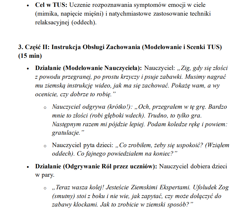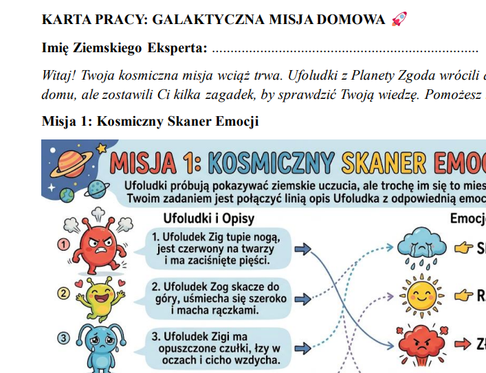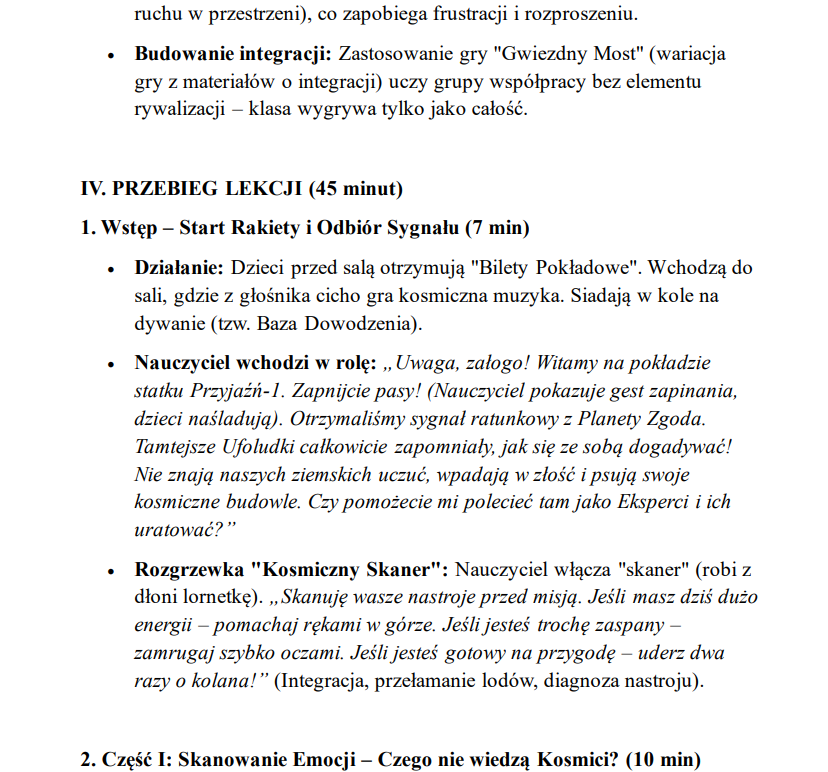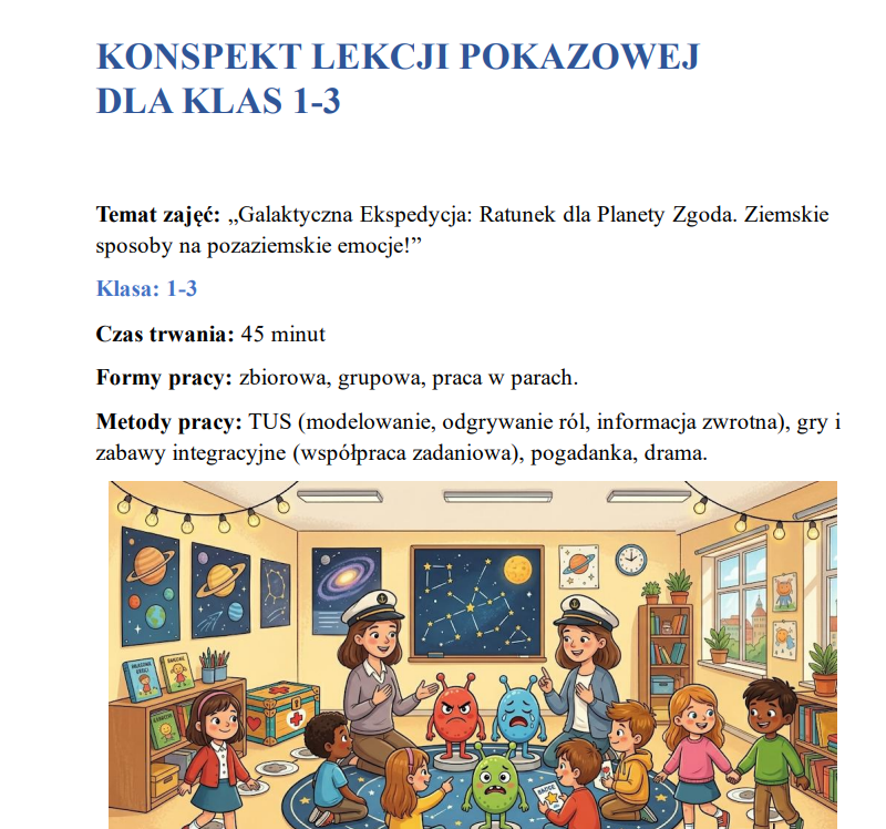 Temat lekcji to „Galaktyczna Ekspedycja: Ratunek dla Planety Zgoda” i dotyczy uczenia dzieci zasad funkcjonowania w relacjach rówieśniczych.