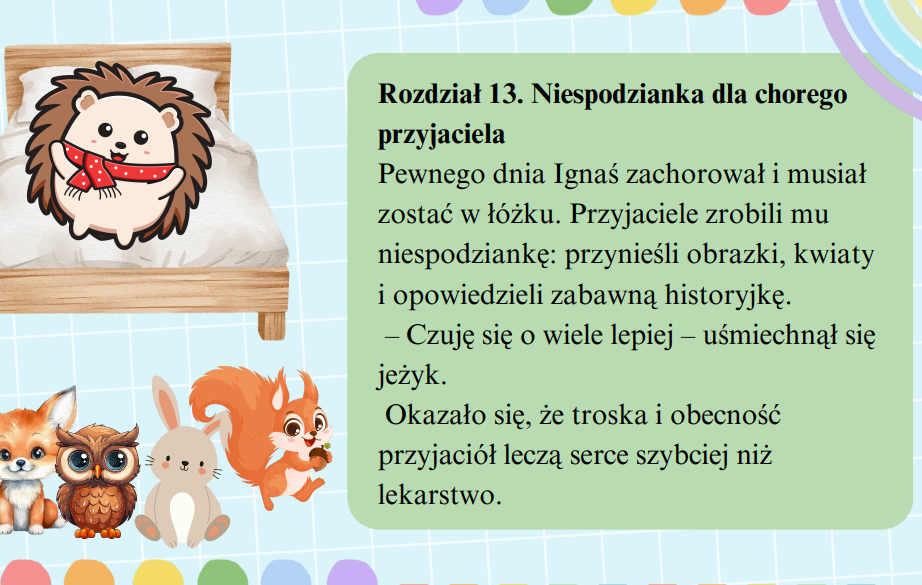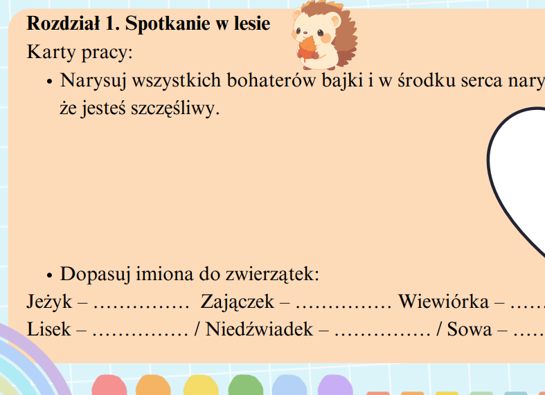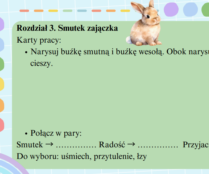 ✅ Karty pracy – angażujące zadania plastyczne, dopasowywanki, uzupełnianki i kolorowanki, które utrwalają wartości płynące z bajki.