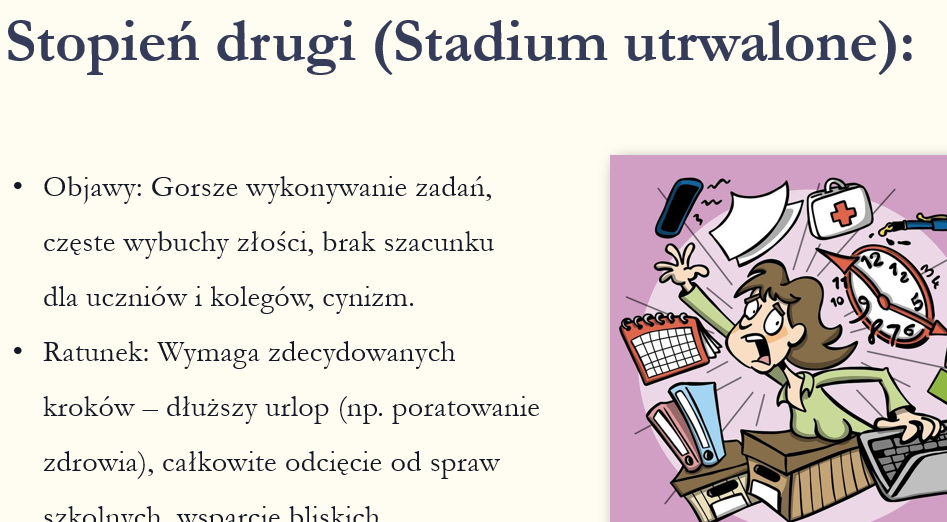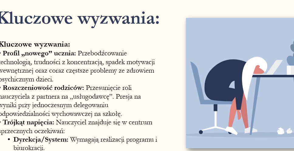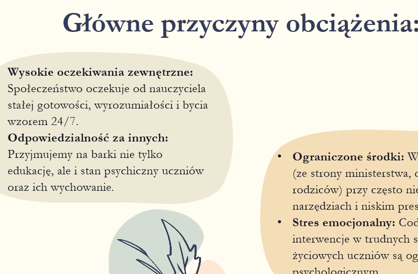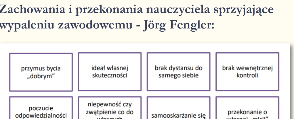 ✅Zawiera analizę przyczyn przeciążenia (m.in. wysokie oczekiwania społeczne, biurokracja, presja ze strony rodziców i systemu), mechanizm „błędnego koła” oraz stopnie nasilenia wypalenia.