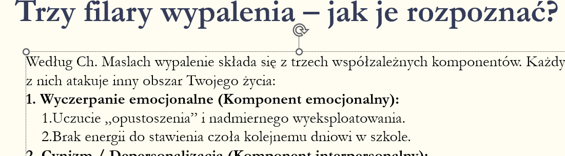 ✅Prezentacja w formie pliku pdf do wydruku i PowerPoint do przedstawienia Radzie Pedagogicznej dotyczy zjawiska wypalenia zawodowego w pracy nauczyciela. Omawia jego definicję, fazy rozwoju oraz trzy główne filary: wyczerpanie emocjonalne, depersonalizację i obniżone poczucie dokonań.