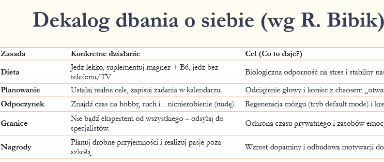 ✔️W drugiej części przedstawione są praktyczne strategie wsparcia w sześciu obszarach relacji z pracą (obciążenie, kontrola, nagroda, społeczność, sprawiedliwość, wartości) oraz konkretne sposoby dbania o dobrostan nauczyciela.Razem 30 slajdów