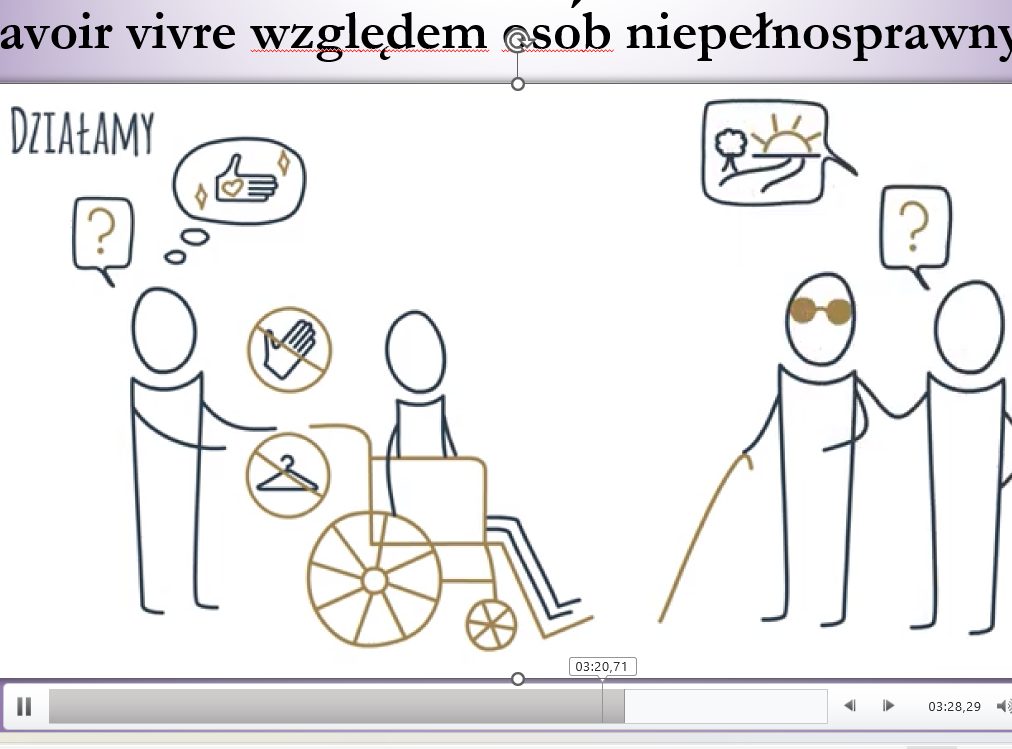 Prezentacja na godziny wychowawcze,warsztaty z młodzieżą,szkolenia na temat osób niepełnosprawnych,ich trudnościach w codziennym życiu.To 29 slajdów z ciekawymi filmikami ,które nauczą w jaki sposób powinniśmy się zachowywać wobec innych aby ich nie urazić i przełamać bariery,niezastapiony materiał o tolerancji,plik pdf i PowerPoint 15 zł