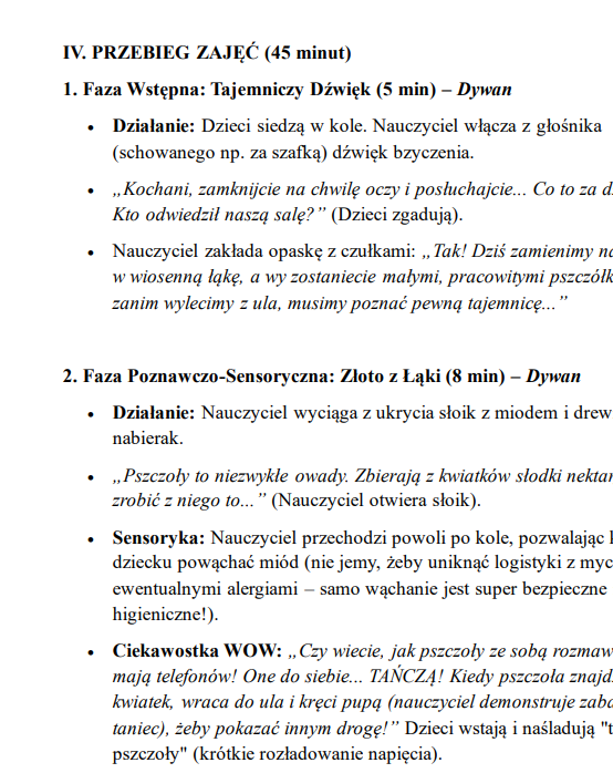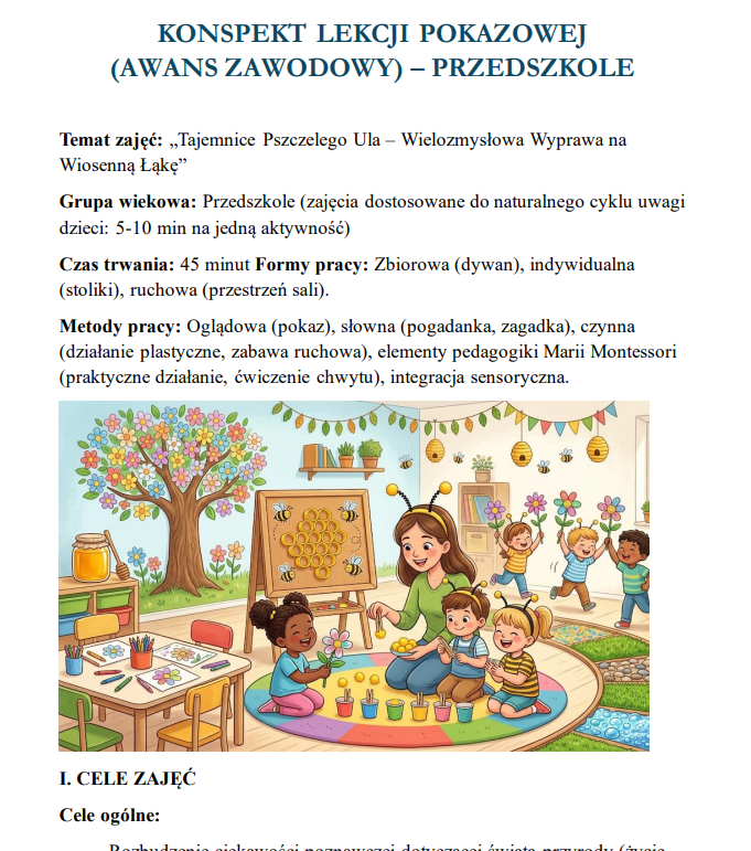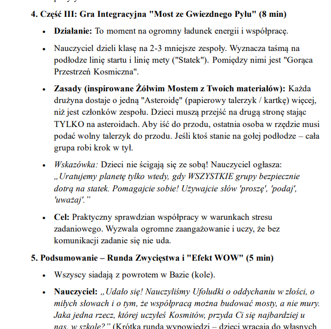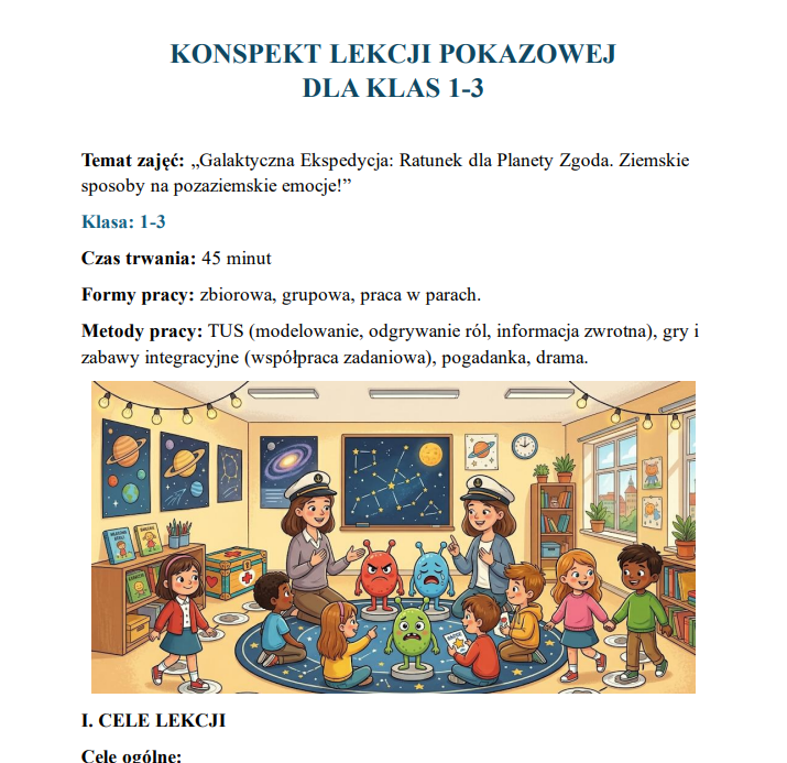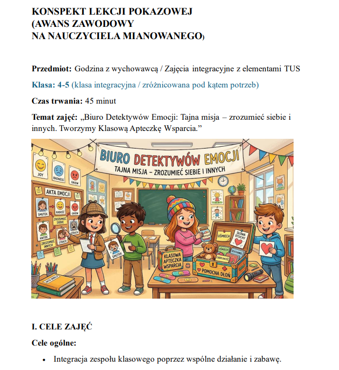 Gotowy pakiet 3 scenariuszy na lekcje pokazowe to praktyczne narzędzie dla nauczycieli ubiegających się o awans zawodowy. Zawiera angażujące, nowoczesne konspekty zajęć dla różnych etapów edukacyjnych (klasy 1–3, 4–5 oraz przedszkole), oparte m.in. na elementach TUS, integracji i pracy z emocjami.