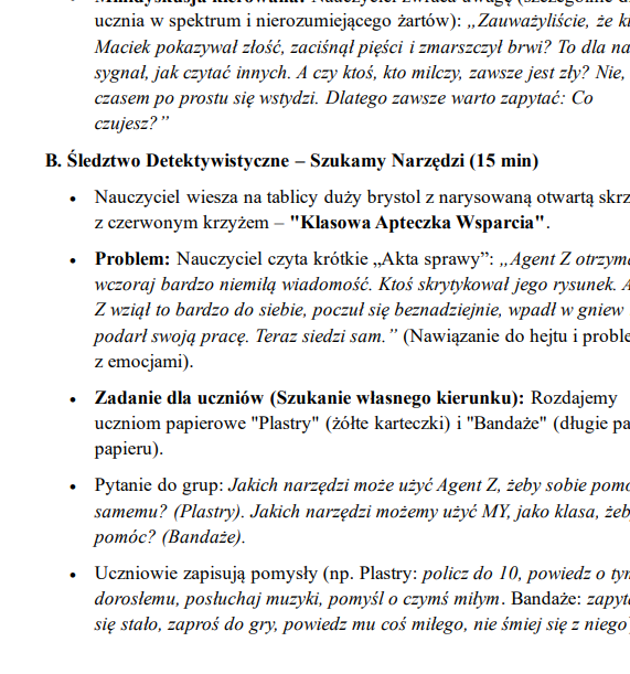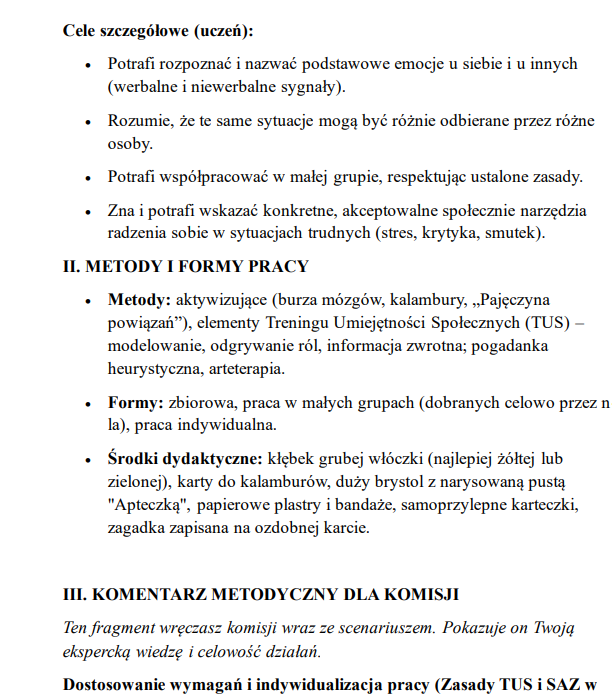 Scenariusze wyróżniają się kreatywną formą (np. „Biuro Detektywów Emocji” czy „Galaktyczna Ekspedycja”), jasno określonymi celami, szczegółowym przebiegiem lekcji oraz komentarzem metodycznym dla komisji, co ułatwia prezentację własnego warsztatu pracy.