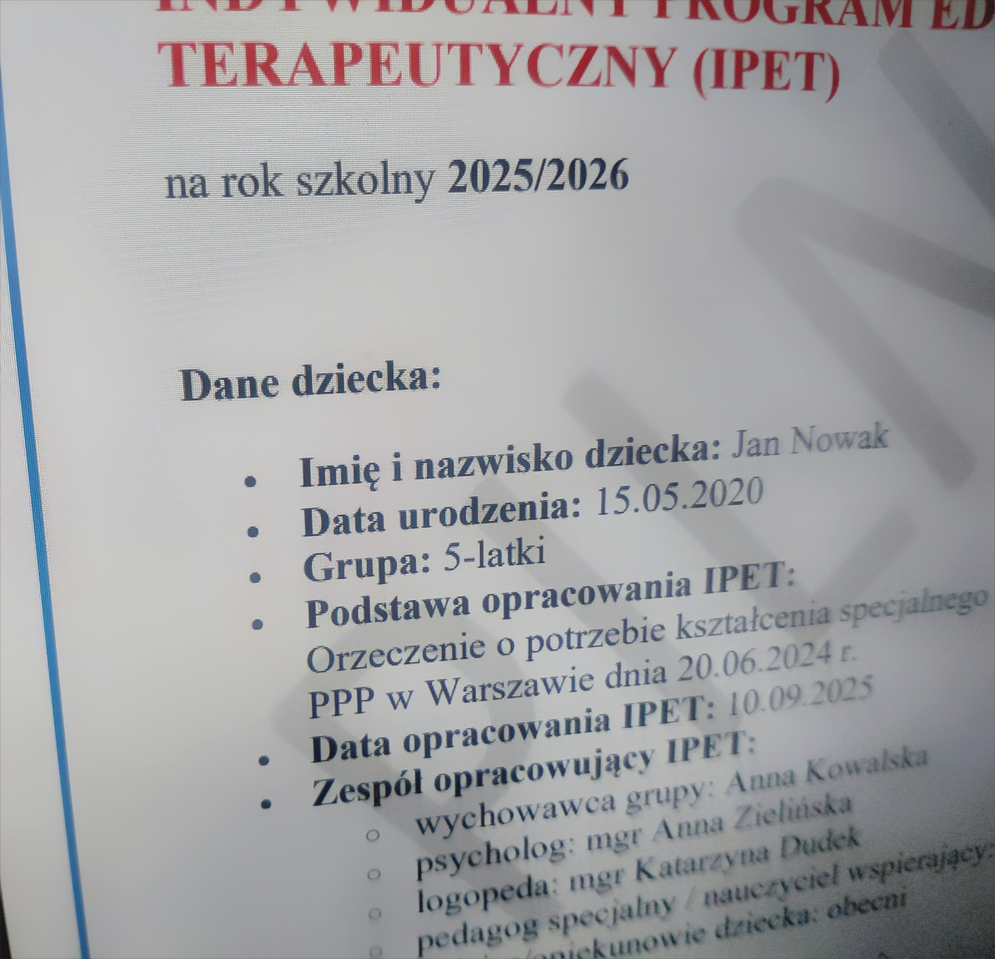 Zawiera WSZYSTKO, co zgodnie z przepisami powinno być w dokumentacji dziecka z orzeczeniem o potrzebie kształcenia specjalnego. Gotowe do druku i edycji!